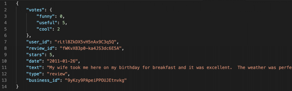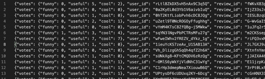 The data is formatted as json-objects where each line in the file corresponds to one review and each review is a json-object.